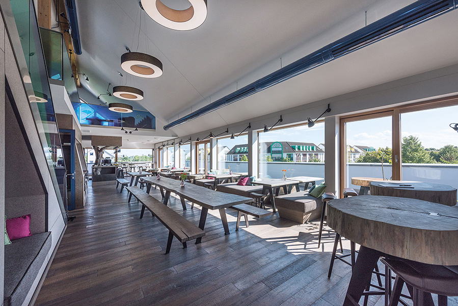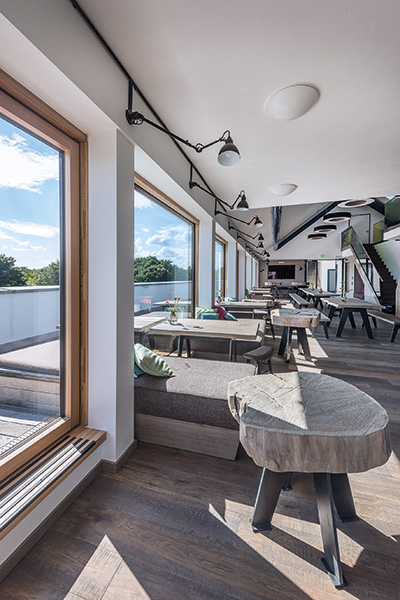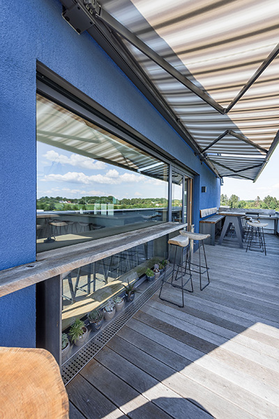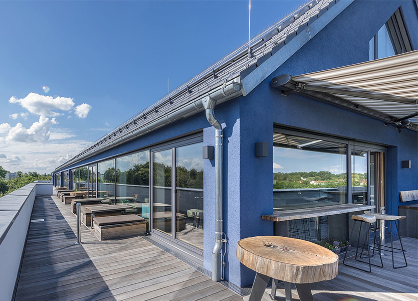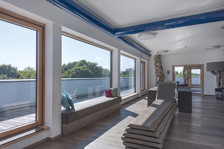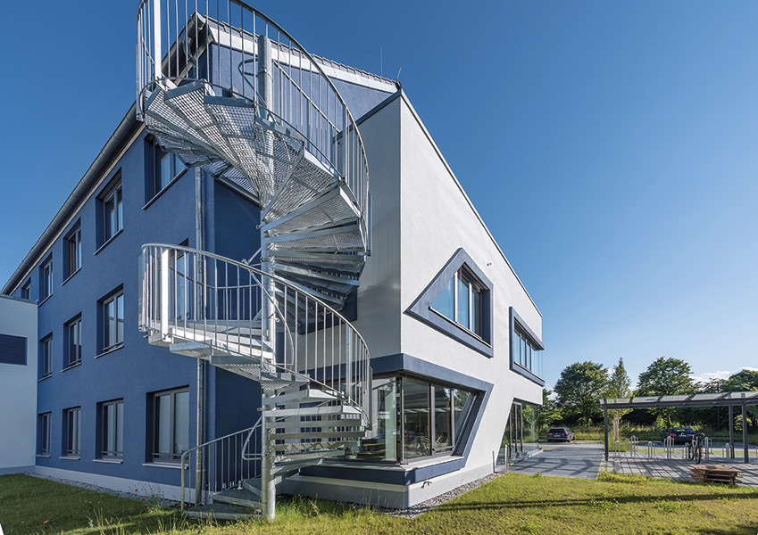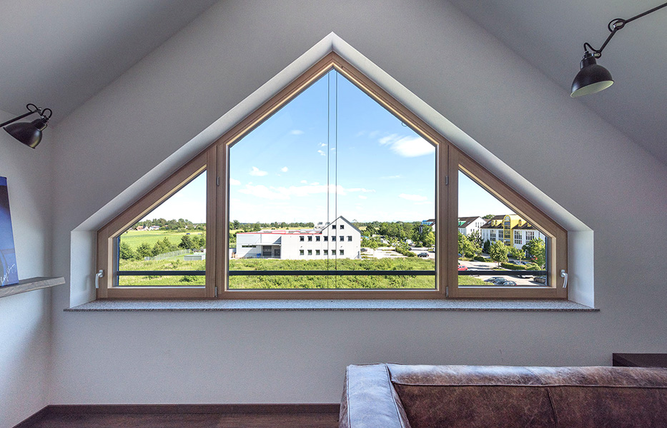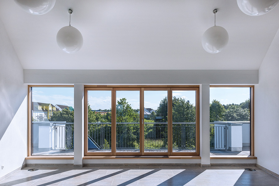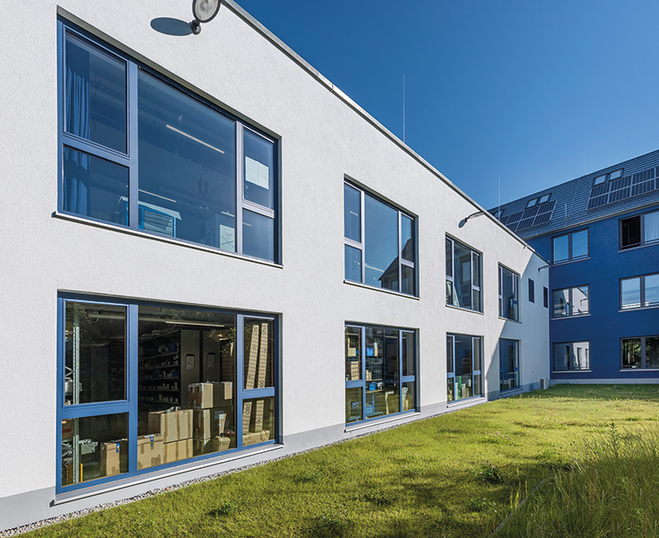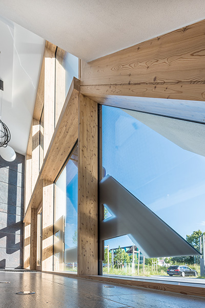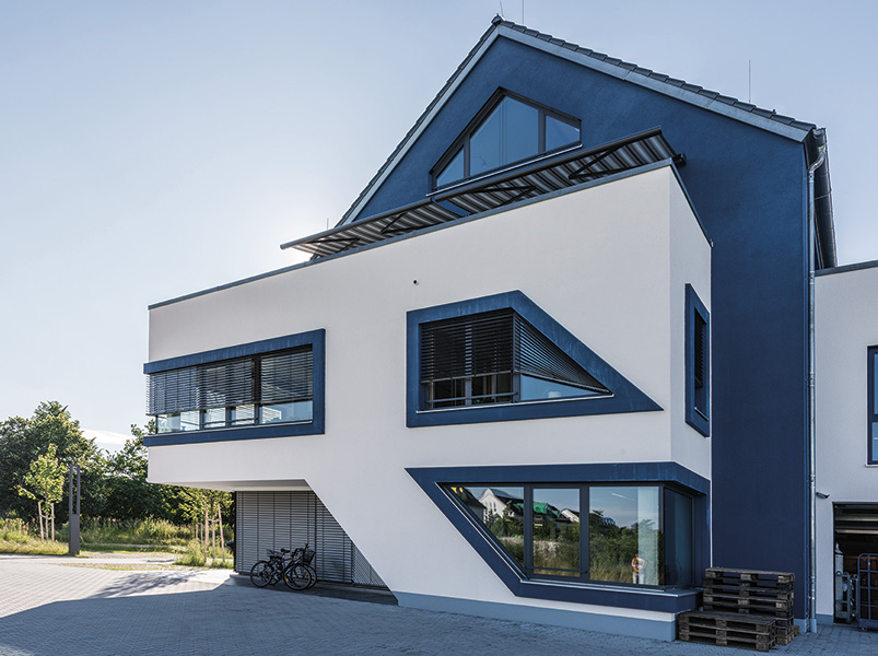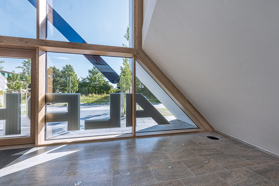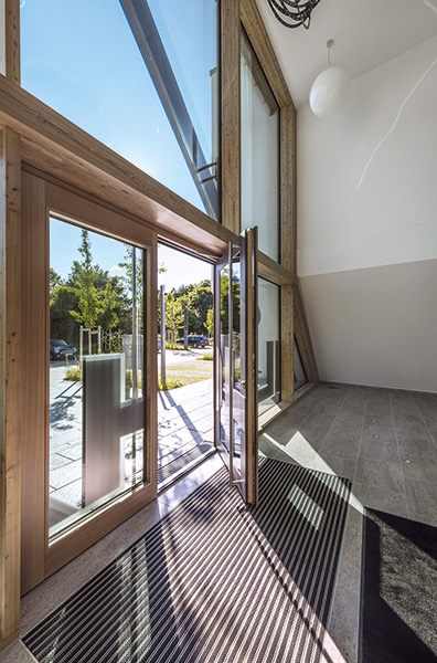 Der repräsentative Bürokomplex ist ein architektonisches Designobjekt. Ausgestattet wurde der Neubau mit energiesparenden Holz-Alu-Fenstern aus Lärchenholz, optisch veredelt mit Effektlack. Eine maßgenau gefertigte Pfosten-Riegel-Konstruktion mit Fensterbank zwischen Betonsäulen verleiht dem modernen Objekt eine ganz besondere Note. Herzstück ist das beeindruckende und einladende Eingangselement in einer Größe von 7,40 x 6 Meter.