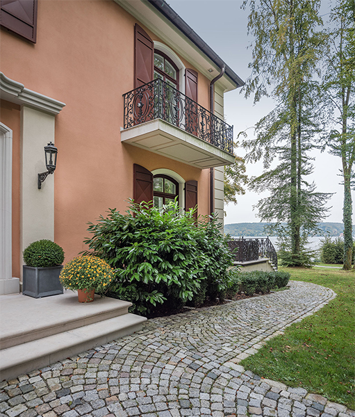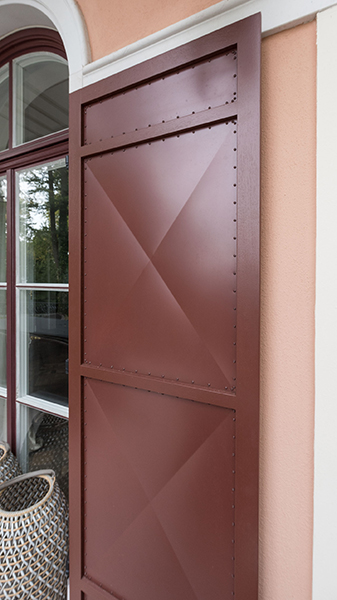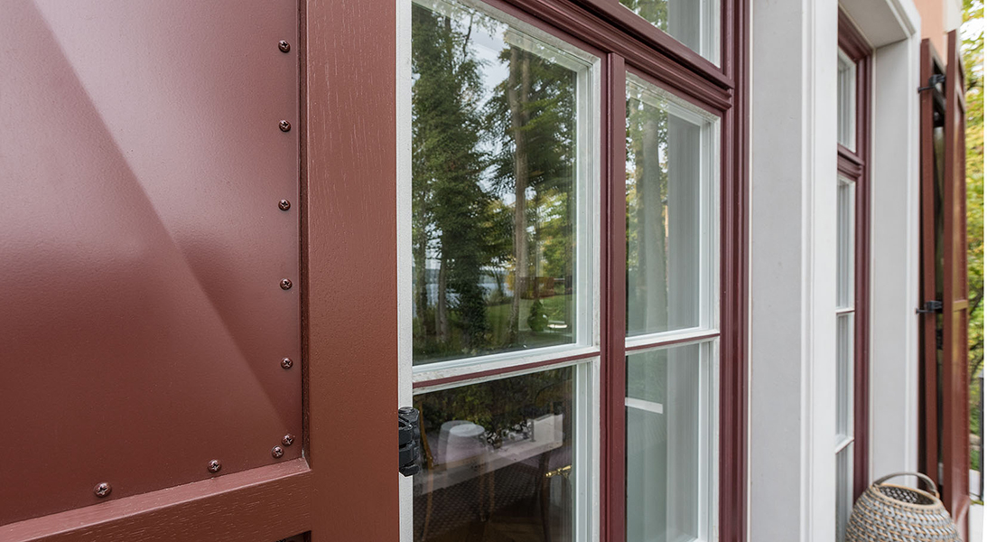 Die neu gebaute Villa mit herrschaftlichem Flair verzieren Fenster aus Eichenholz, die innen weiß und außen rot lackiert sind. Die Verbundfenster mit Kittfalz beherbergen zwei Flügel mit Einfachglas und ihre Beschläge sind exklusive Basküleverschlüsse. Eine Besonderheit sind die rot lackierten Fensterläden mit Maueranschlag. Diese sind aus Eichenholz mit einer bombierten Aluminiumfüllung. Um die außergewöhnliche Optik einer Nietung zu erreichen, wurden 10.000 rot lackierte Schrauben zur Befestigung der Füllung von Hand verschraubt. Noch erwähnenswert: Die Kämpfer- und Schlagleistenprofile wurden ganz individuell nach Kundenwunsch gefertigt.