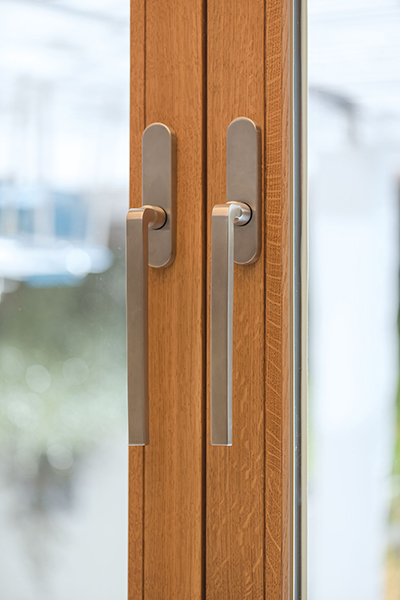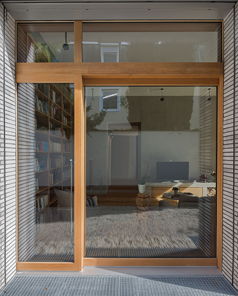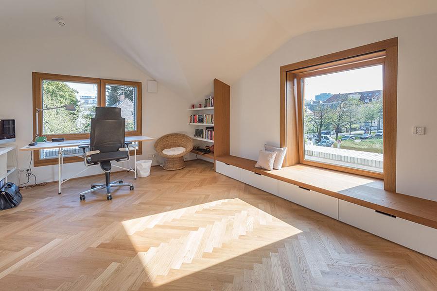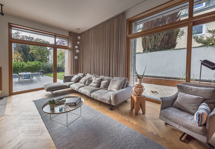 In München-Schwabing entstand ein schmuckes Wohnhaus mit lasierten Eichenfenstern, die abwechselnd innen oder außen bündig sitzen. Bei den Außenbündigen hat das Innenfutter eine integrierte Beschattung. Die Fenster laufen im Raster der Klinkersteine der Aussenfassade. Allerdings musste beim Einpassen kein Stein in der Höhe geschnitten werden. Und diese Mechanik wurde fortgesetzt. So laufen auch die Hebe-Schiebe-Türen in Mauertaschen. Abgerundet wird das Gesamtbild mit dem Haustürelement in Eichenholz mit seitlichem Paneel und Garagentürverkleidung. Die innen bündige Haustüre verläuft mit dem Garagentor in einer Flucht.