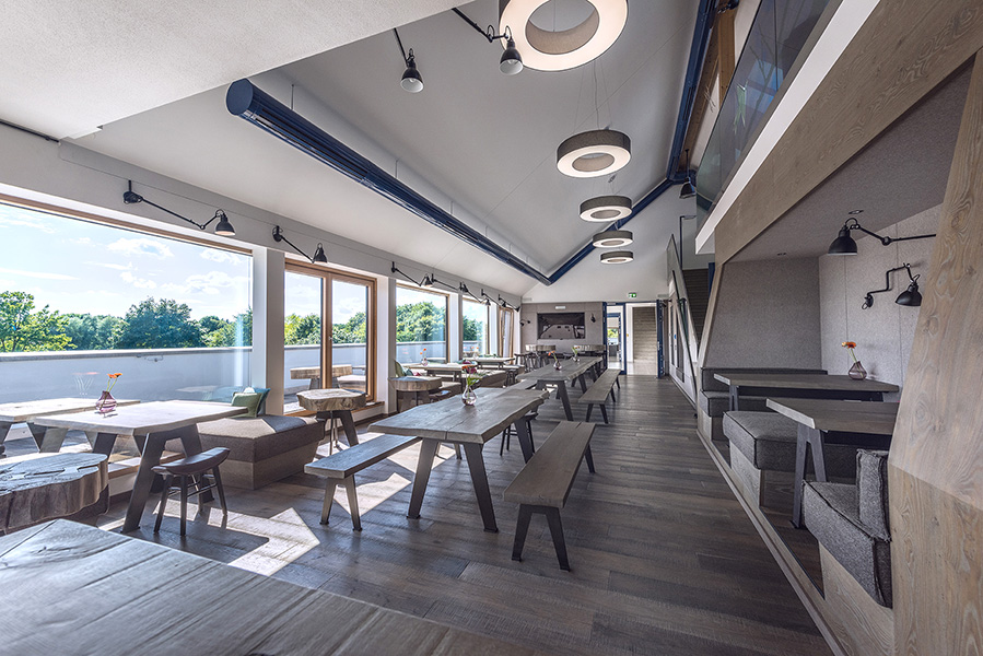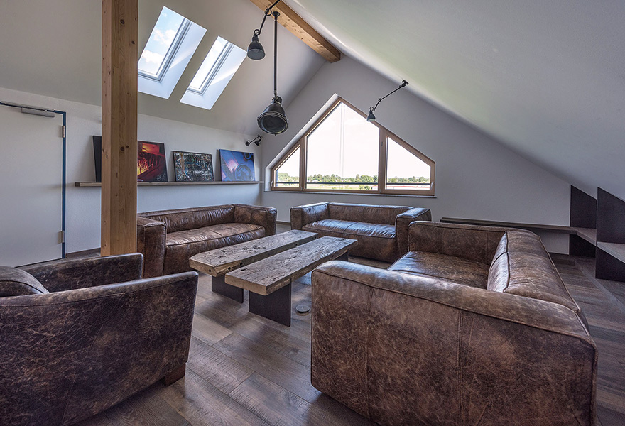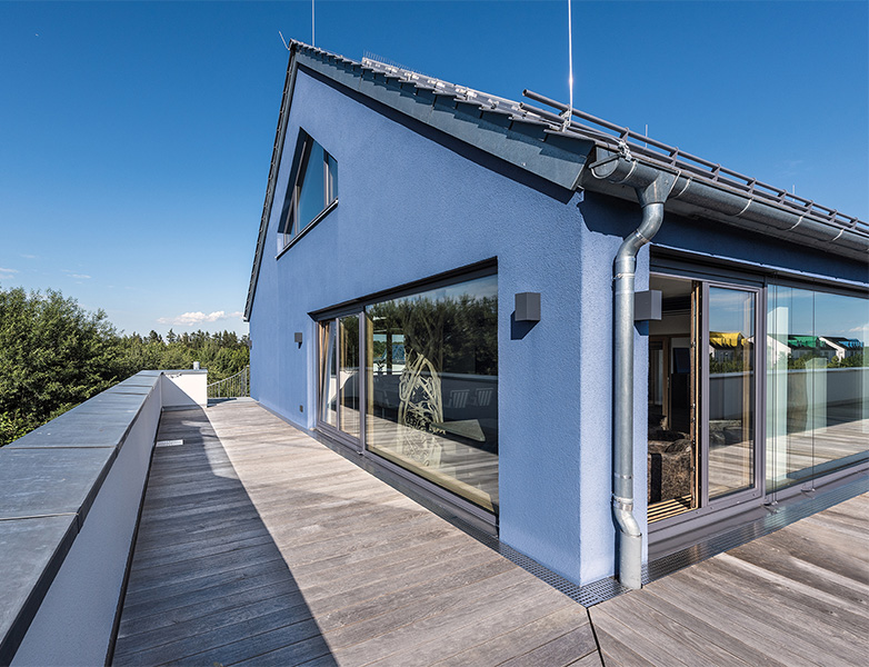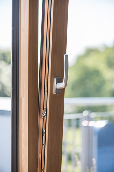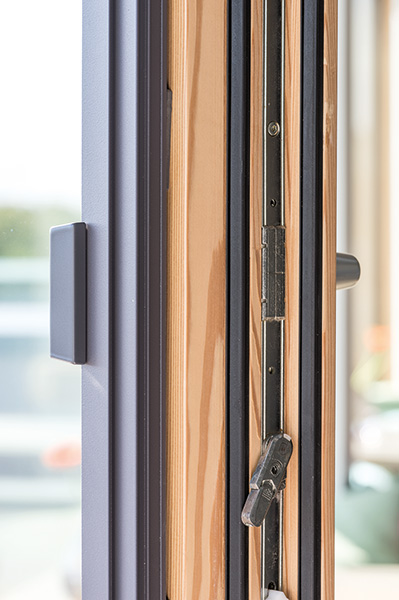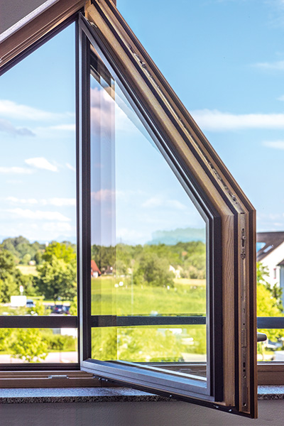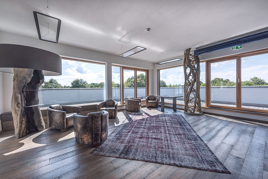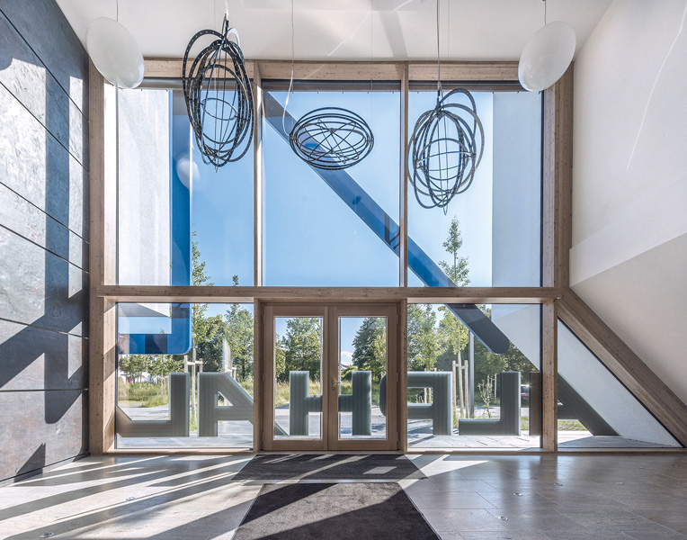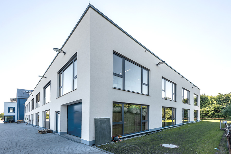 Der repräsentative Bürokomplex ist ein architektonisches Designobjekt. Ausgestattet wurde der Neubau mit energiesparenden Holz-Alu-Fenstern aus Lärchenholz, optisch veredelt mit Effektlack. Eine maßgenau gefertigte Pfosten-Riegel-Konstruktion mit Fensterbank zwischen Betonsäulen verleiht dem modernen Objekt eine ganz besondere Note. Herzstück ist das beeindruckende und einladende Eingangselement in einer Größe von 7,40 x 6 Meter.