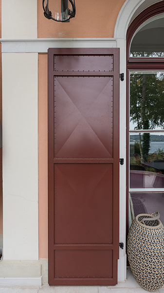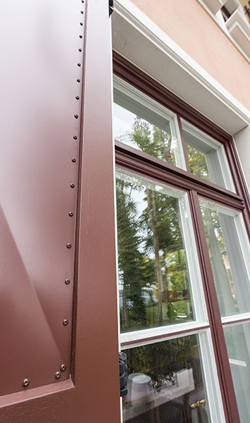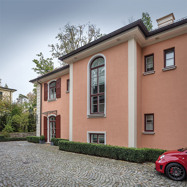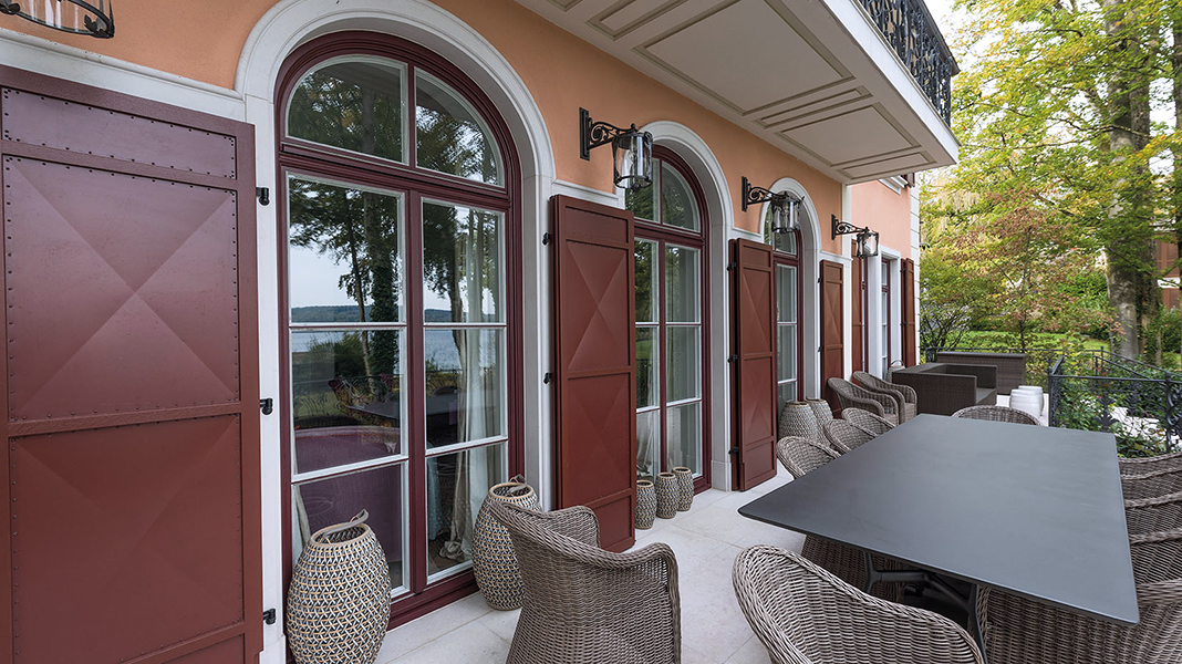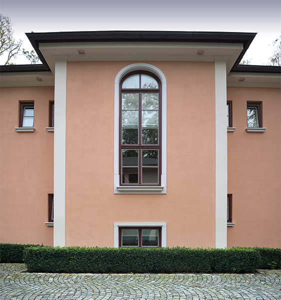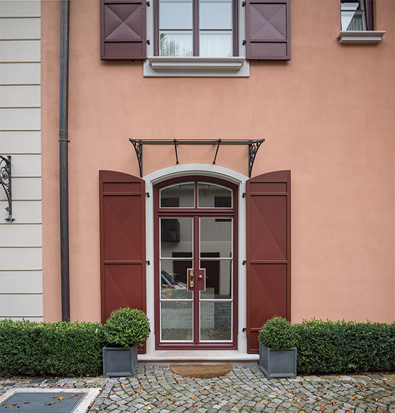 Die neu gebaute Villa mit herrschaftlichem Flair verzieren Fenster aus Eichenholz, die innen weiß und außen rot lackiert sind. Die Verbundfenster mit Kittfalz beherbergen zwei Flügel mit Einfachglas und ihre Beschläge sind exklusive Basküleverschlüsse. Eine Besonderheit sind die rot lackierten Fensterläden mit Maueranschlag. Diese sind aus Eichenholz mit einer bombierten Aluminiumfüllung. Um die außergewöhnliche Optik einer Nietung zu erreichen, wurden 10.000 rot lackierte Schrauben zur Befestigung der Füllung von Hand verschraubt. Noch erwähnenswert: Die Kämpfer- und Schlagleistenprofile wurden ganz individuell nach Kundenwunsch gefertigt.