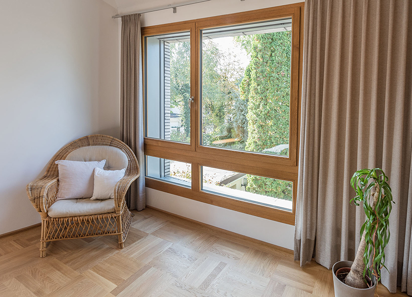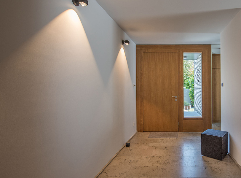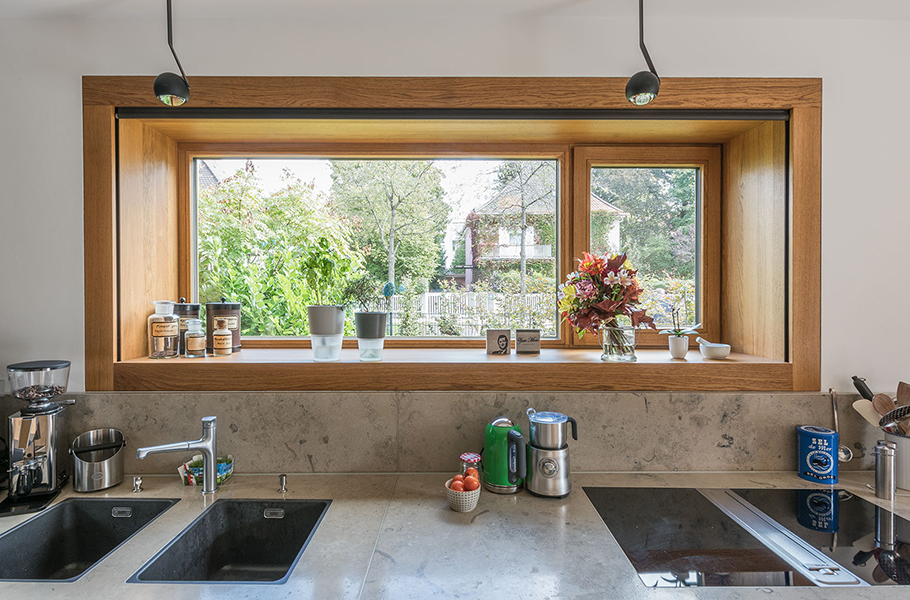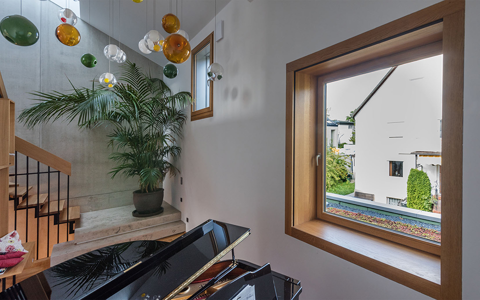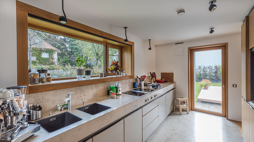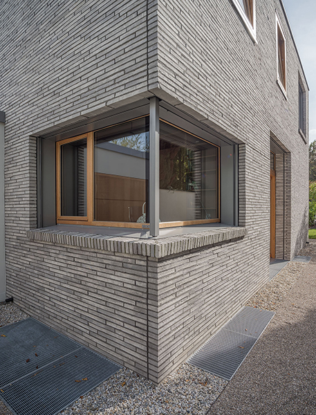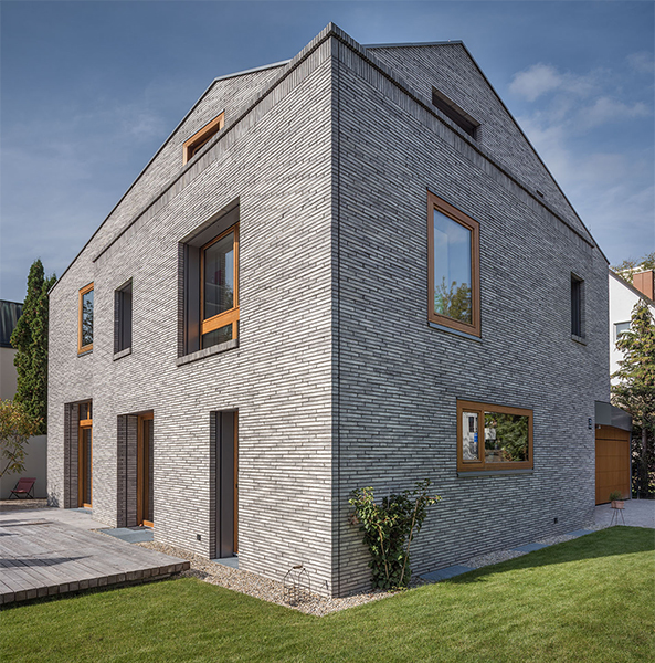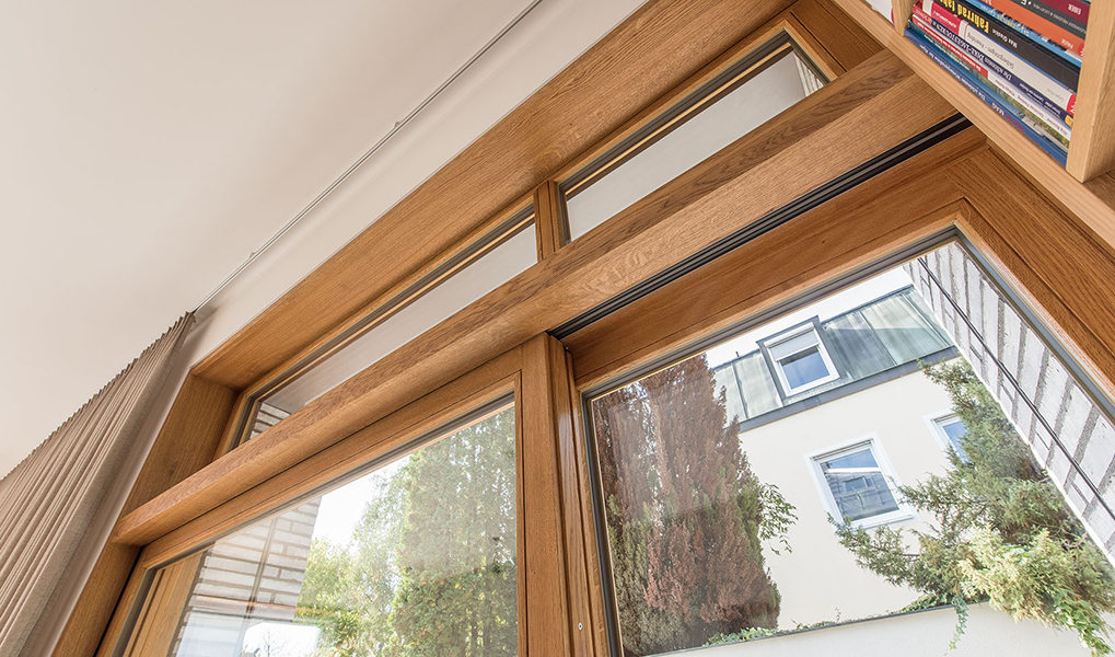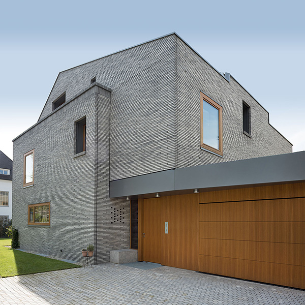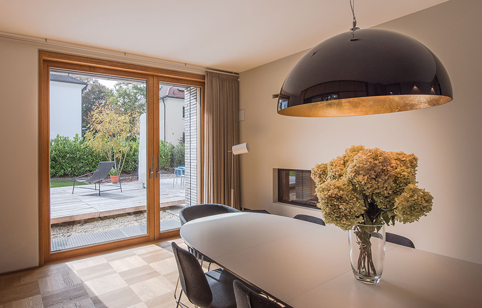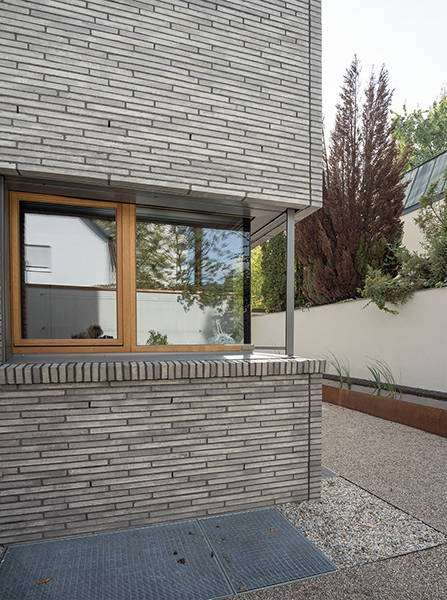 In München-Schwabing entstand ein schmuckes Wohnhaus mit lasierten Eichenfenstern, die abwechselnd innen oder außen bündig sitzen. Bei den Außenbündigen hat das Innenfutter eine integrierte Beschattung. Die Fenster laufen im Raster der Klinkersteine der Aussenfassade. Allerdings musste beim Einpassen kein Stein in der Höhe geschnitten werden. Und diese Mechanik wurde fortgesetzt. So laufen auch die Hebe-Schiebe-Türen in Mauertaschen. Abgerundet wird das Gesamtbild mit dem Haustürelement in Eichenholz mit seitlichem Paneel und Garagentürverkleidung. Die innen bündige Haustüre verläuft mit dem Garagentor in einer Flucht.