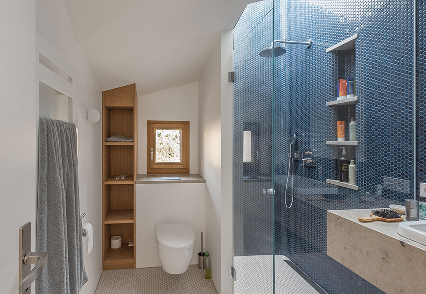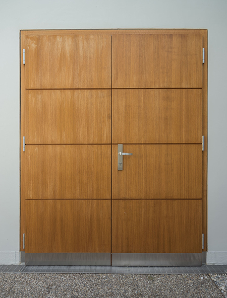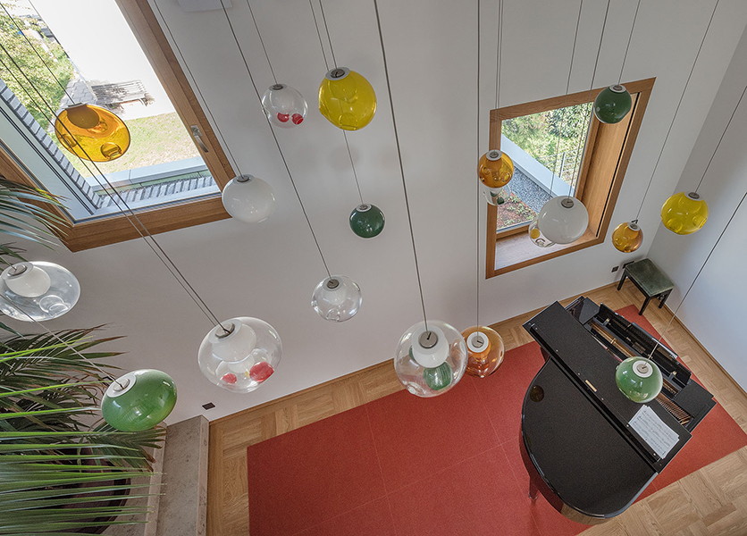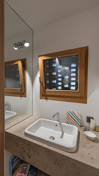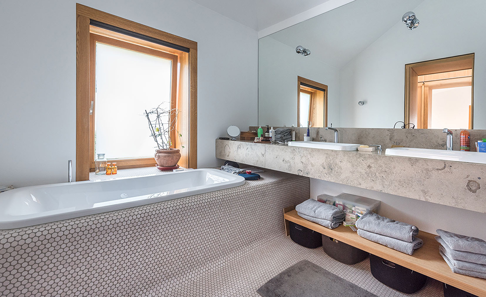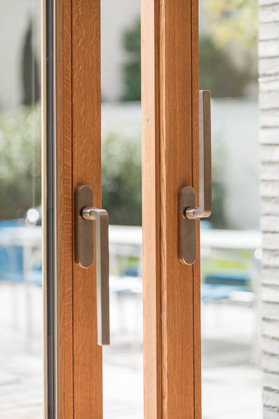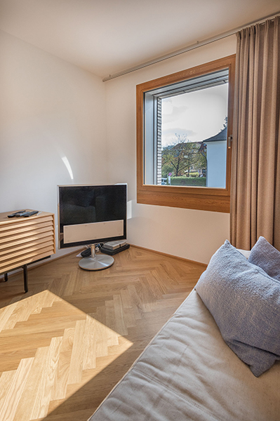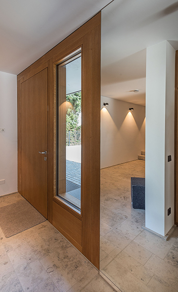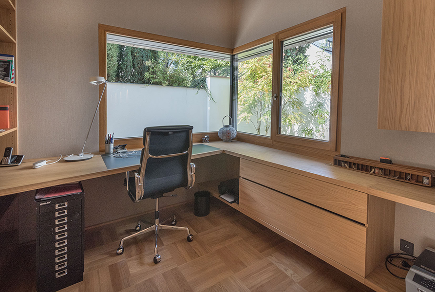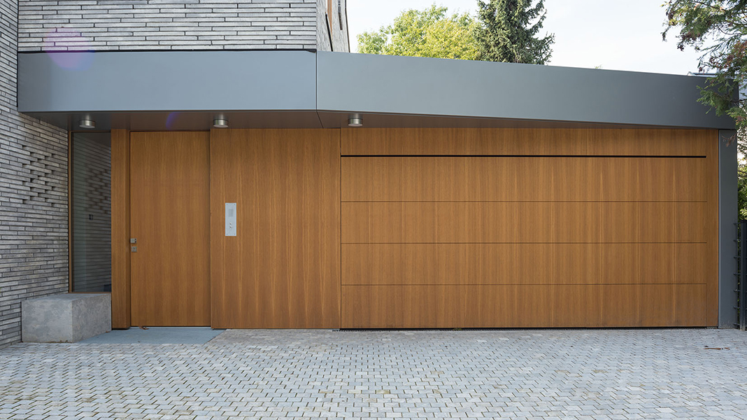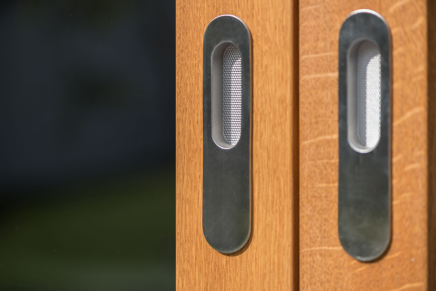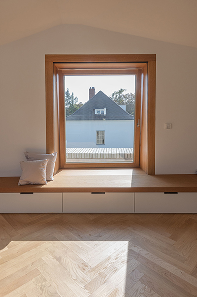 In München-Schwabing entstand ein schmuckes Wohnhaus mit lasierten Eichenfenstern, die abwechselnd innen oder außen bündig sitzen. Bei den Außenbündigen hat das Innenfutter eine integrierte Beschattung. Die Fenster laufen im Raster der Klinkersteine der Aussenfassade. Allerdings musste beim Einpassen kein Stein in der Höhe geschnitten werden. Und diese Mechanik wurde fortgesetzt. So laufen auch die Hebe-Schiebe-Türen in Mauertaschen. Abgerundet wird das Gesamtbild mit dem Haustürelement in Eichenholz mit seitlichem Paneel und Garagentürverkleidung. Die innen bündige Haustüre verläuft mit dem Garagentor in einer Flucht.